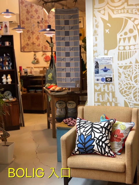 入口にはヴィンテージ家具とイロトリドリのインテリア品がお出迎え♪