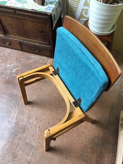 実は教会など施設で使われていた椅子なので座面が持ち上がります。