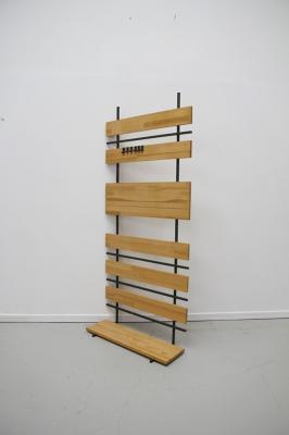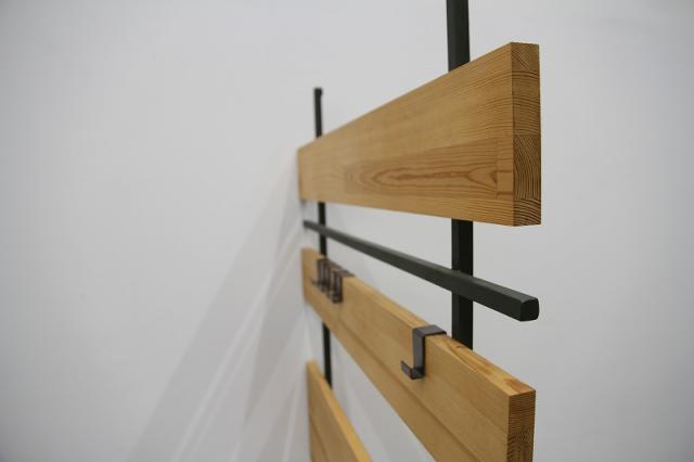 壁面に立てかけて使う目的で製作しています。自立していませんので、壁面に立てかけてお使いください。L型ですので、ぶら下げるアイテムの重量にご注意の上、お使いください。