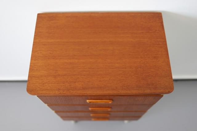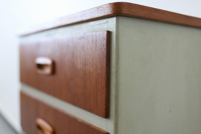 スウェーデンから届いたコンパクトな4段チェスト。スウェーデンチークと白にペイントされたデザインの組み合わせがなんとも目を惹きます。小振りなサイズなので狭いスペースにも置きやすく、小物の整理整頓にも重宝するタイプの家具です。