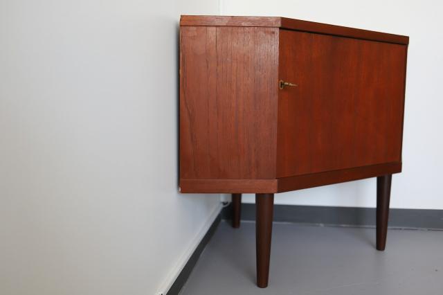 北欧デンマーク買付便のコーナーキャビネット。お部屋の角にスッキリと収めることができる収納家具です。珍しい背が低いタイプなので、圧迫感なくお部屋のスペースをうまく活用することができますよ。