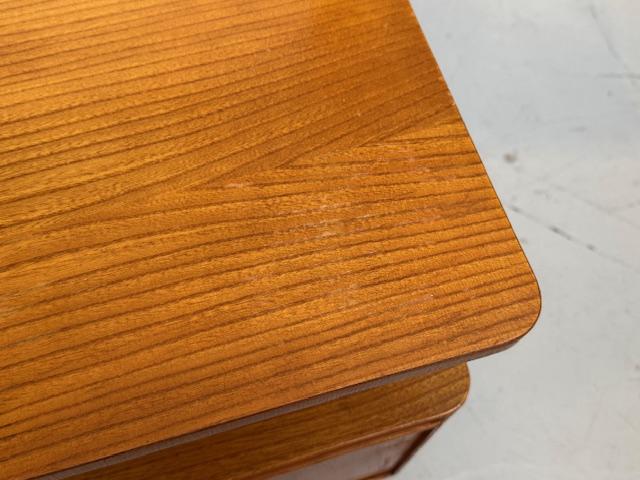 素材にはエルム材を使用。やわらかな木目とあたたかみのある色合いが魅力で、経年による深みのある風合いも楽しめます。丸みを帯びた天板のラインやすっきりとした脚部のバランスが美しく、1940年代らしい上品で落ち着いた佇まいです。