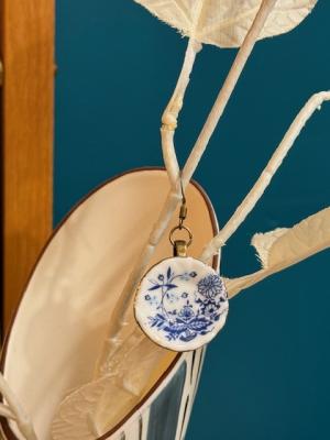 ヴィンテージのプレートのようなモチーフには、ブルーの小花や葉が描かれています。他ではあまり見ないような珍しいデザインで、個性的なデザインがお好きな方やギフトにもオススメです。