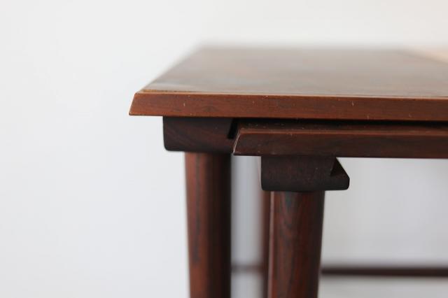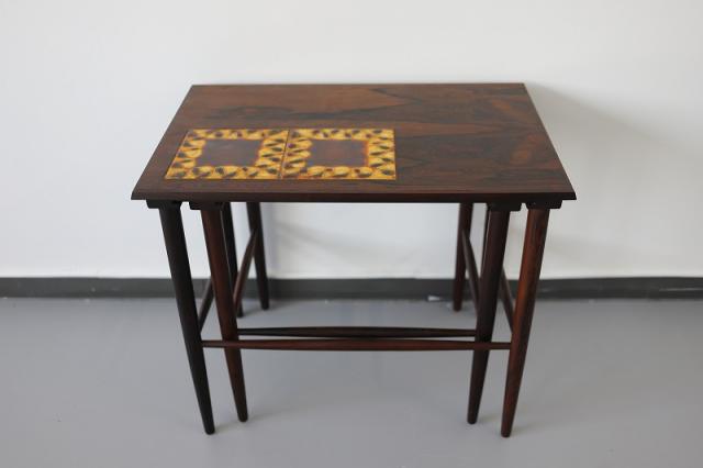北欧デンマーク製のネストテーブルです。ネストとは「入れ子」の意味があることばで、大きなサイズのテーブルに小さなサイズのテーブルがきれいに収まるつくりの家具です。ワンポイントのタイルがデザインのポイント。力強いローズウッドの木目も雰囲気が出ます。