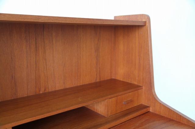 北欧デンマーク買付のライティングビューローです。ビューローとは、書棚や引き出しなどの収納家具とデスクが一体化した家具のことをいいます。これは天板を手前に引き出すことでデスクとして使用することが出来るタイプのデザインです。