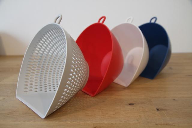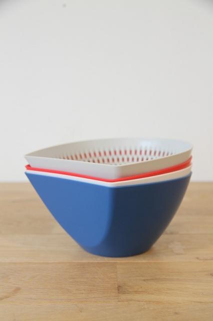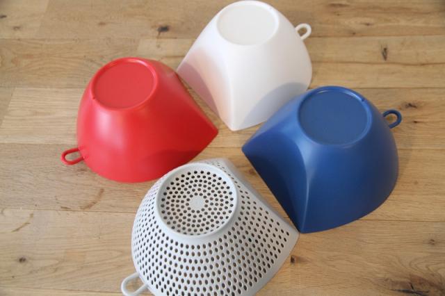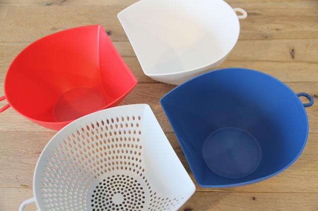 赤・白・青のトリコロールカラーのボウルとザルのセットで、キッチンが華やかに彩られます。