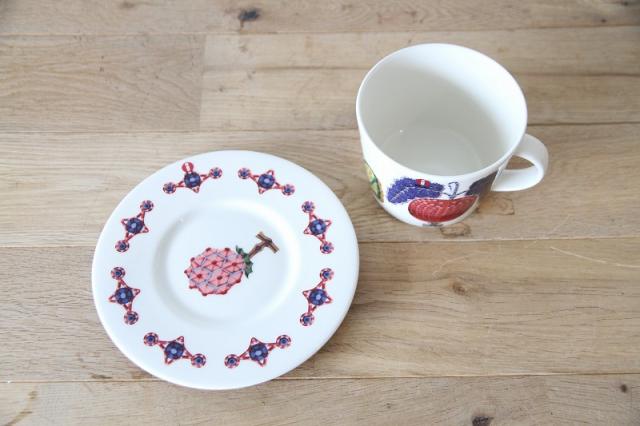 赤や緑、黄色といった果実のモチーフは、まるで北欧の秋の庭を思わせるよう。