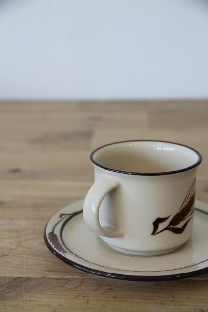 1970年代に製造されたカップ&ソーサーで、ベージュ掛かったベースに実りの季節を思わせるハンドペイントの麦の穂がアクセントになっています。