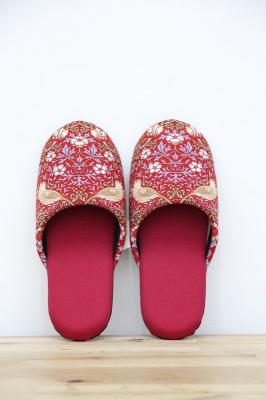 19世紀イギリスで活躍したデザイナー、ウィリアム・モリスのデザインした『いちご泥棒』プリントのファブリックを使用したソフトスリッパです。