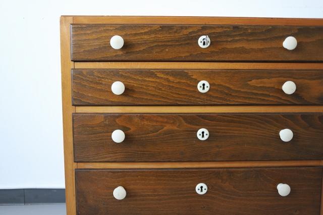 北欧デンマーク買付便の4段チェストです。ツートンの木目と引き出しの取手などの白のパーツの組み合わせがとってもレトロ。どっしりとしたつくりで安定感があります。