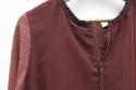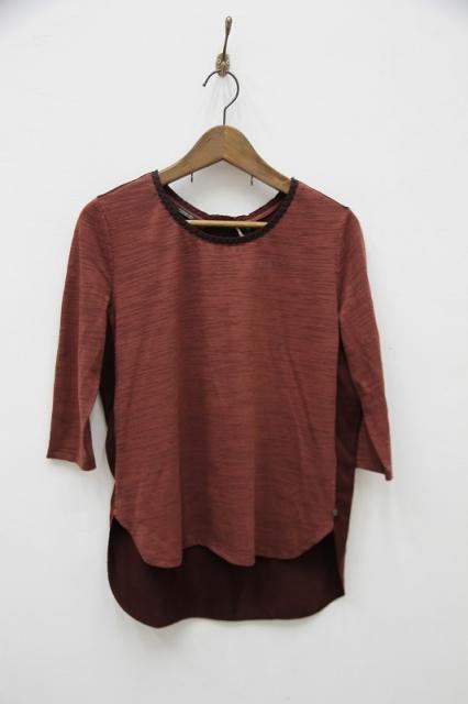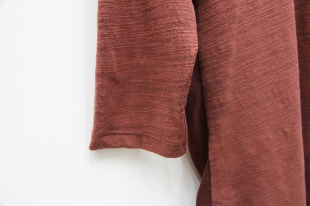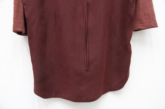 前後の生地が異素材になっており前後の雰囲気違いを楽しめる七分袖Tシャツ。首回りのデザインや後ろのZIPが特徴的で女性らしく、インナーとしてもインパクトある一枚になっております。ワイドパンツや、細めのパンツどちらでも合わせやすいです。