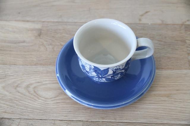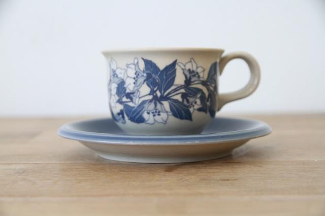 ブルーグレーのソーサーに、同一色の野花がカップにプリントされた落ち着きのある大人っぽい雰囲気のカップ&ソーサー。