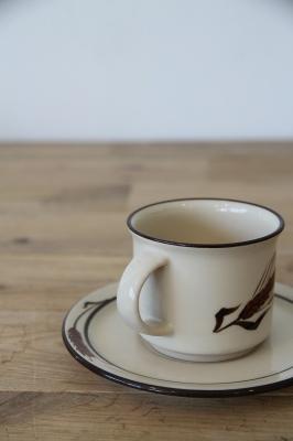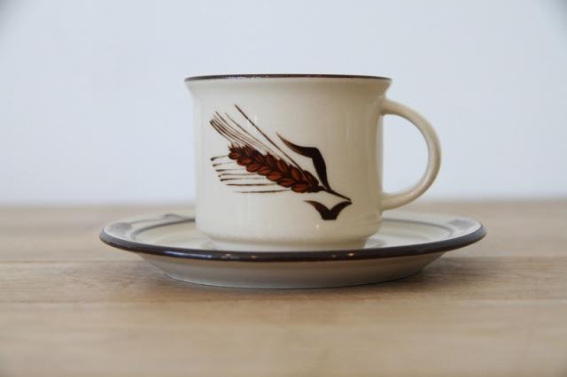 1970年代に製造されたカップ&ソーサーで、ベージュ掛かったベースに実りの季節を思わせるハンドペイントの麦の穂がアクセントになっています。