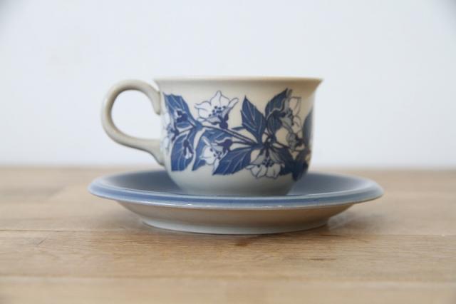 ブルーグレーのソーサーに、同一色の野花がカップにプリントされた落ち着きのある大人っぽい雰囲気のカップ&ソーサー。