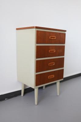 スウェーデンから届いたコンパクトな4段チェスト。スウェーデンチークと白にペイントされたデザインの組み合わせがなんとも目を惹きます。小振りなサイズなので狭いスペースにも置きやすく、小物の整理整頓にも重宝するタイプの家具です。