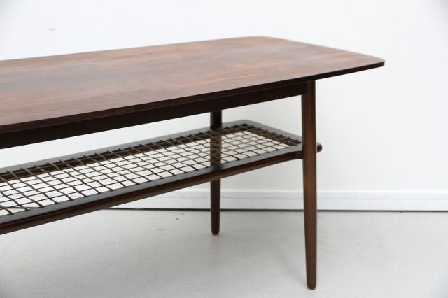 1960~70年代製の北欧デンマーク製のコーヒーテーブルです。なんともローズウッドの木目が美しく、凛とした佇まいを感じるテーブル。天板はローズウッドの突板、棚板のフレーム部分や脚は無垢のローズウッドが使われています。