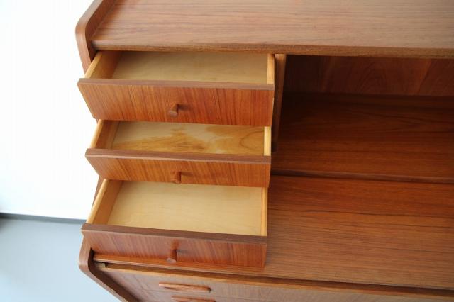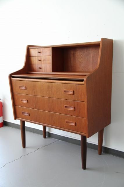 北欧デンマーク買付のライティングビューローです。ビューローとは、書棚や引き出しなどの収納家具とデスクが一体化した家具のことをいいます。これは天板を手前に引き出すことでデスクとして使用することが出来るタイプのデザインです。その天板を持ち上げると鏡が付いている仕様です。