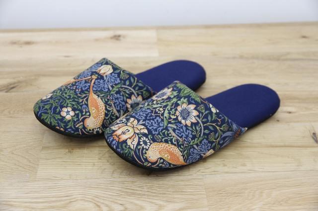 19世紀イギリスで活躍したデザイナー、ウィリアム・モリスのデザインした『いちご泥棒』プリントのファブリックを使用したソフトスリッパです。