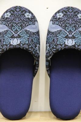 19世紀イギリスで活躍したデザイナー、ウィリアム・モリスのデザインした『いちご泥棒』プリントのファブリックを使用したソフトスリッパです。