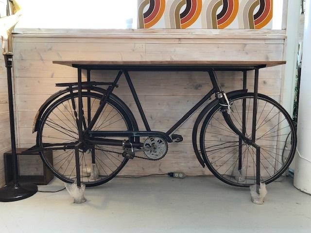 長年使い続けてきた味わい深い自転車に天然木を組合せたアップサイクルなコンソールテーブル。