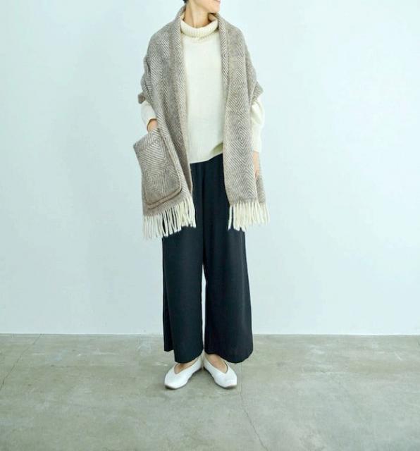 このポケットショールは本当にロングセラーで世界中にファンいますが、シンプルな形なのにさっと肩に羽織って