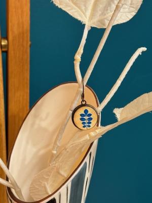 エンボス加工された木材に、小ぶりなエメラルドグリーンのリーフデザインが施されたピアスです。