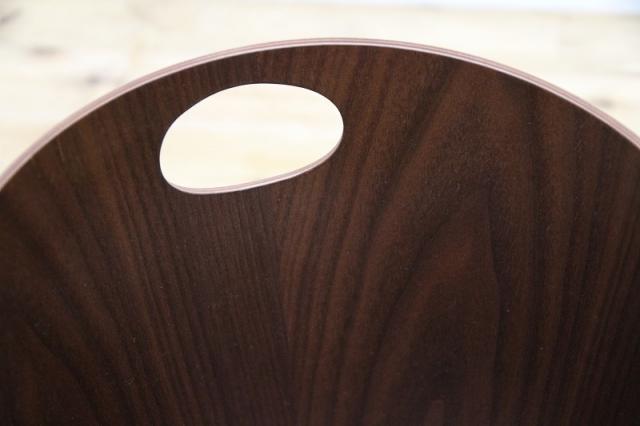 成形合板とは、厚さ0.2~1mmに薄くした板材を、木目を互い違いにして奇数枚重ねて張り合わせ、それを型にはめ、熱と圧力をかけて形を作る木工技術です。