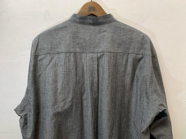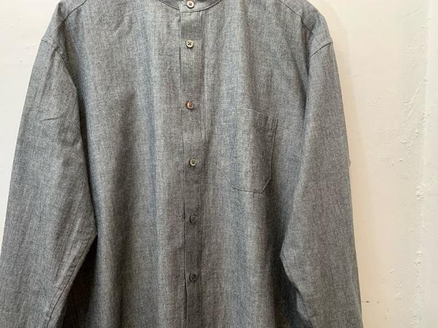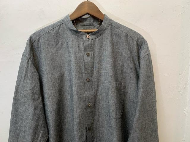 関西の工業地帯の中で、ひとりで旧織機のみを使用して生地を製作している機職人にシャツを作るために織って頂いた、綿シャンブレー生地です。色糸と白糸を交互に配列して織った後、生地の状態で数回丁寧に芯から揉みこんで洗いをかけるため、仕上がりがとても柔らかく軽いです。ドレスのようなシャンブレーにもかかわらず、その洗い込みのために、新品の状態でも少し毛羽が立っているようなカジュアルな雰囲気を醸し出します。初夏まで羽織として使用できるバンドカラーの長袖シャツです。お洗濯後に寸法の変化が見られない素材です。