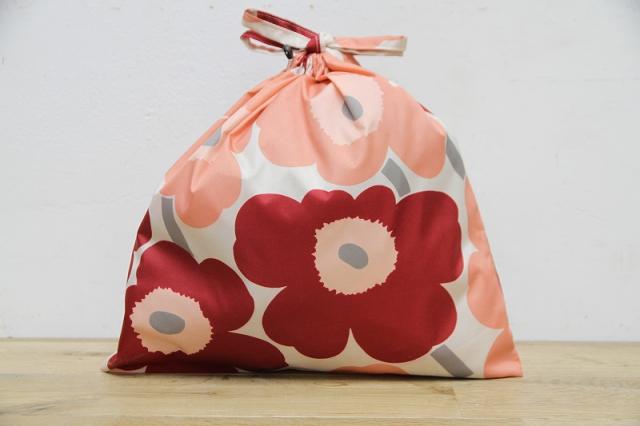 ケシの花をモチーフにした大きい花柄が特徴的でマリメッコの代表的なウニッコデザインの巾着ポーチ。