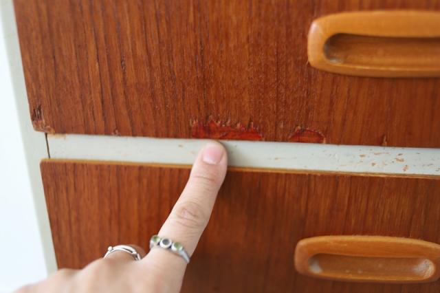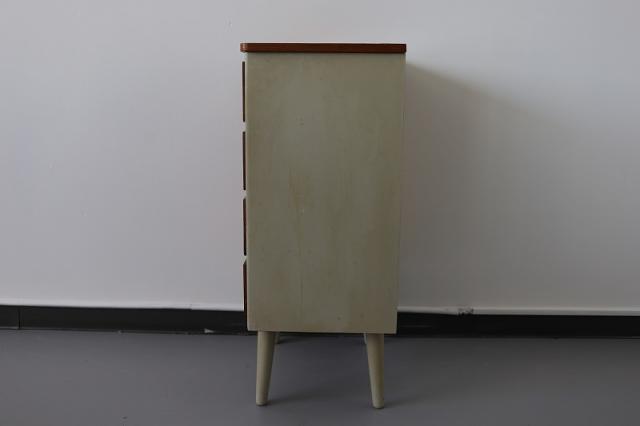 スウェーデンから届いたコンパクトな4段チェスト。スウェーデンチークと白にペイントされたデザインの組み合わせがなんとも目を惹きます。小振りなサイズなので狭いスペースにも置きやすく、小物の整理整頓にも重宝するタイプの家具です。