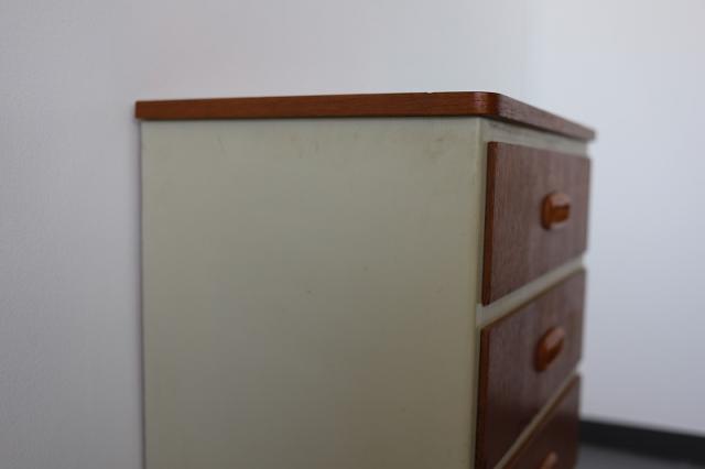 スウェーデンから届いたコンパクトな4段チェスト。スウェーデンチークと白にペイントされたデザインの組み合わせがなんとも目を惹きます。小振りなサイズなので狭いスペースにも置きやすく、小物の整理整頓にも重宝するタイプの家具です。