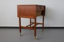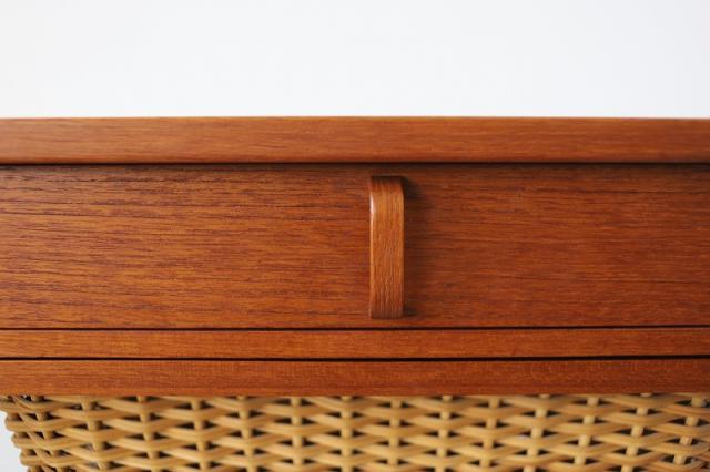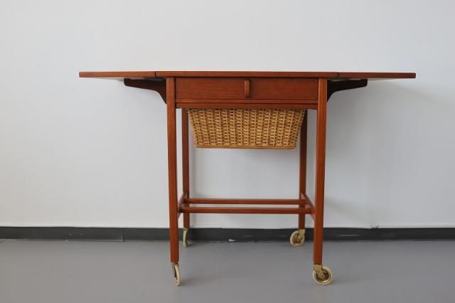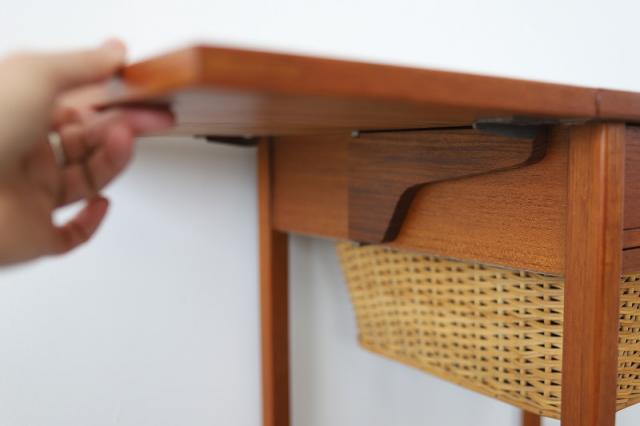 北欧で手芸用の収納とテーブルとして作られたソーイングテーブルと呼ばれる家具です。仕切りのある引き出しと可愛いカゴ収納で整理整頓がしやすく、エクステンション付きの天板はシチュエーションに合わせて広げて使うことができ、機能性の高さも魅力なデザインです。ソファーに座って使うサイズではなく、椅子に合わせて丁度いい高さ73cmというサイズはとっても珍しいと思います。
