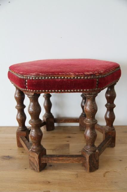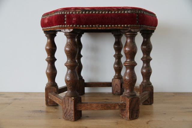 脚部には、オーク材と思われる木材を使用。美しい彫りが施された6本の脚が、スツールの安定感を高め、どの角度から見ても存在感のある佇まいを演出します。