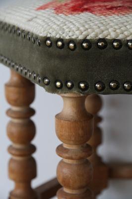 座面には上品な花柄の織り生地が使用されており、ほどよくクッション性があるため、ふっくらとした優しい印象。周囲にはアンティーク調の鋲装飾が施され、クラシカルな雰囲気を漂わせています。