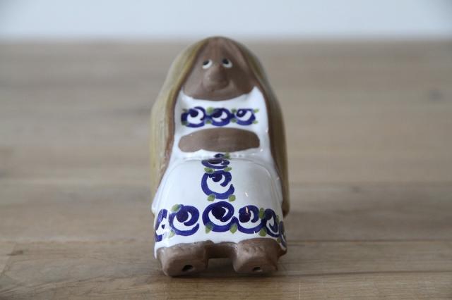 白地にブルーの爽やかな模様が映える、ワンピースを着た女の子の陶器人形です。