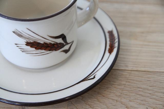 1970年代に製造されたカップ&ソーサーで、ベージュ掛かったベースに実りの季節を思わせるハンドペイントの麦の穂がアクセントになっています。