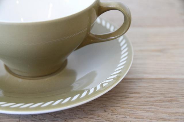 カップは底にかけて美しいカーブで絞られ、ソーサーの縁に沿って施された細い白いロープ模様シンプルでいながら存在感があり、印象的かつ飽きのこないデザインです。