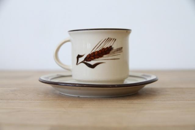 1970年代に製造されたカップ&ソーサーで、ベージュ掛かったベースに実りの季節を思わせるハンドペイントの麦の穂がアクセントになっています。