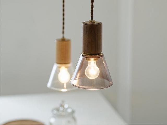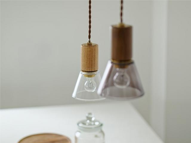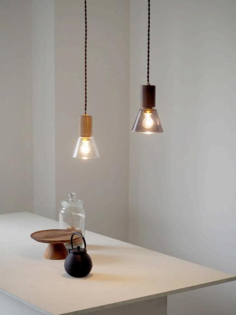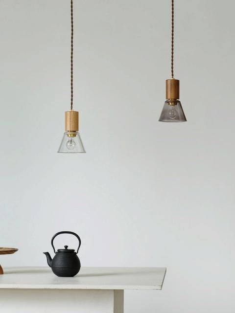ぬくもりを感じさせる木製ソケットカバーと、厚みがあり末広がりに広がるガラスセードが織りなす、端正で心地よいプロポーションのペンダントライトです。