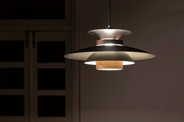 上下に重なる3枚のスチールと2つの木製リングによって生まれる、光の“グラデーション”。上部からは天井側にも柔らかな光が広がり、下部からはテーブル上を優しく包み込みます。