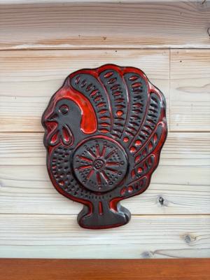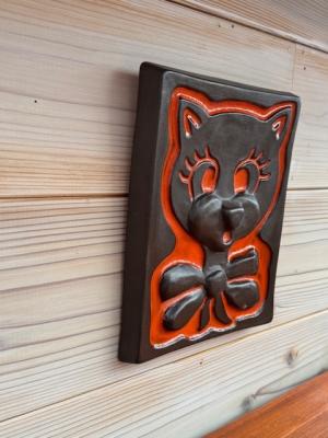 ネコをモチーフにした素朴でやさしい表情と、釉薬の表情豊かな風合いが相まって、北欧陶芸らしい味わいを感じさせます。壁に掛けるだけで、空間に落ち着きとほどよい彩りを添えてくれる一枚です。
