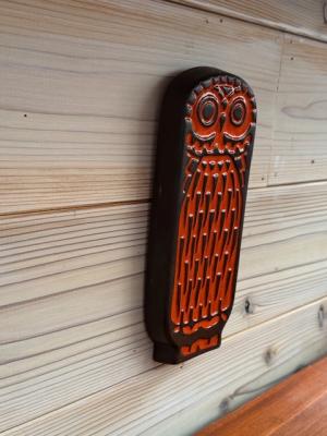 フクロウをモチーフにした素朴でやさしい表情と、釉薬の表情豊かな風合いが相まって、北欧陶芸らしい味わいを感じさせます。壁に掛けるだけで、空間に落ち着きとほどよい彩りを添えてくれる一枚です。