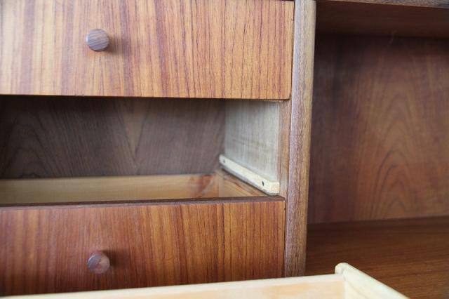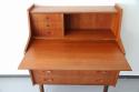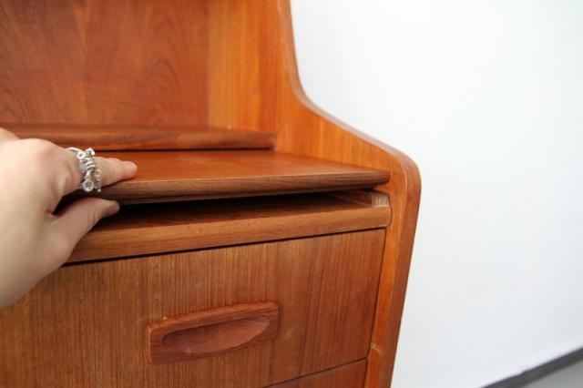 北欧デンマーク買付のライティングビューローです。ビューローとは、書棚や引き出しなどの収納家具とデスクが一体化した家具のことをいいます。これは天板を手前に引き出すことでデスクとして使用することが出来るタイプのデザインです。その天板を持ち上げると鏡が付いている仕様です。