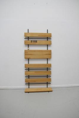 壁面に立てかけて使う目的で製作しています。自立していませんので、壁面に立てかけてお使いください。L型ですので、ぶら下げるアイテムの重量にご注意の上、お使いください。
