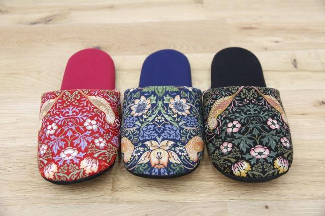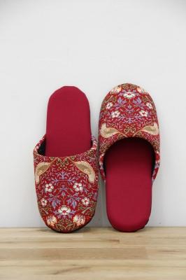 19世紀イギリスで活躍したデザイナー、ウィリアム・モリスのデザインした『いちご泥棒』プリントのファブリックを使用したソフトスリッパです。