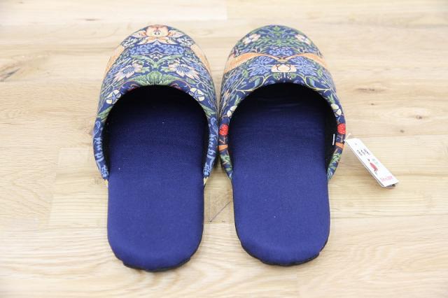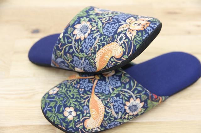 19世紀イギリスで活躍したデザイナー、ウィリアム・モリスのデザインした『いちご泥棒』プリントのファブリックを使用したソフトスリッパです。