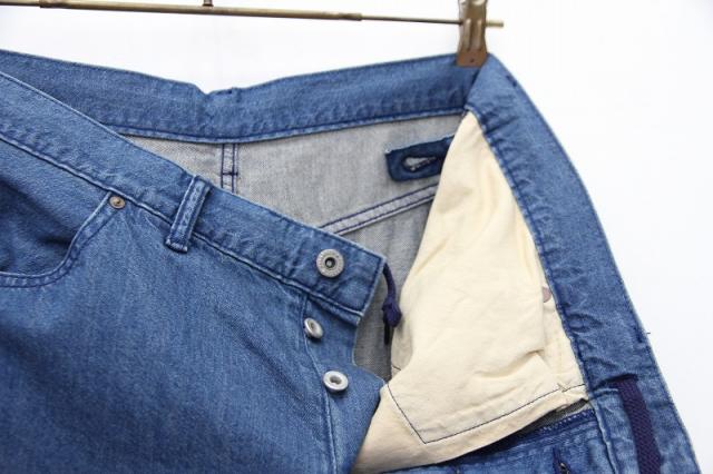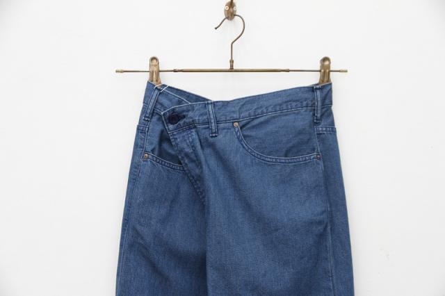 ビッグサイズのジーンズをアレンジしたパンツです。ウエストの紐を絞って穿いたり、内側とサイドのボタンを留めてタイパンツのようにして着用頂ける2WAY仕様になっております。夏でも快適に着用して頂けるよう、ライトオンスのデニムを使用しています。パンツのデザインが特徴的なので、Tシャツなどシンプルなトップス合わせでも個性ある印象でスタイリングできます。