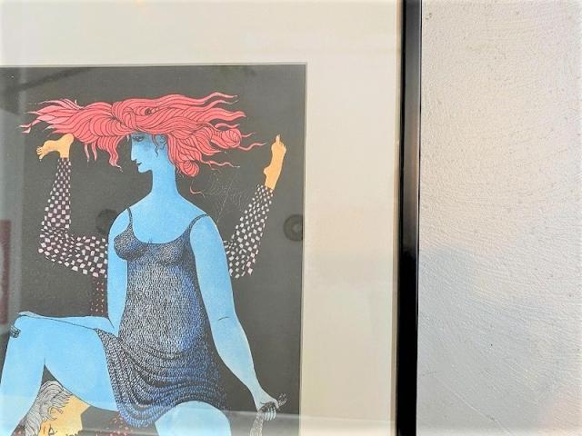 黒い背景にインパクトのある赤髪と青い肌の傷心の女性と、ガラスの靴を女性の足に履かせようとしている男性の、ストーリー性のある画面構成により想像を膨らませられます。