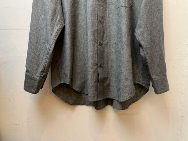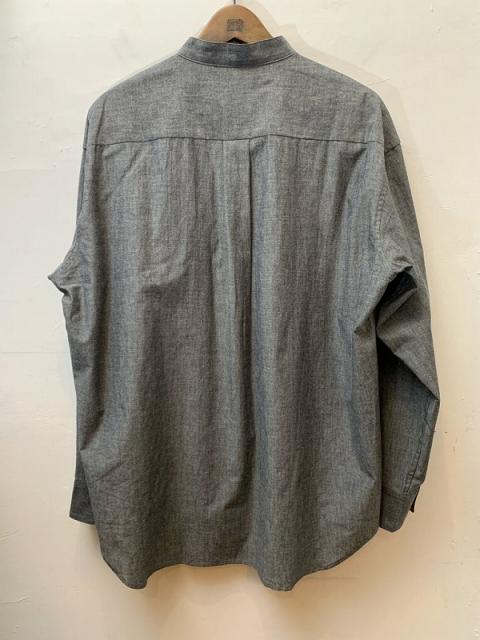 関西の工業地帯の中で、ひとりで旧織機のみを使用して生地を製作している機職人にシャツを作るために織って頂いた、綿シャンブレー生地です。色糸と白糸を交互に配列して織った後、生地の状態で数回丁寧に芯から揉みこんで洗いをかけるため、仕上がりがとても柔らかく軽いです。ドレスのようなシャンブレーにもかかわらず、その洗い込みのために、新品の状態でも少し毛羽が立っているようなカジュアルな雰囲気を醸し出します。初夏まで羽織として使用できるバンドカラーの長袖シャツです。お洗濯後に寸法の変化が見られない素材です。
