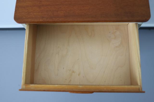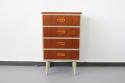 スウェーデンから届いたコンパクトな4段チェスト。スウェーデンチークと白にペイントされたデザインの組み合わせがなんとも目を惹きます。小振りなサイズなので狭いスペースにも置きやすく、小物の整理整頓にも重宝するタイプの家具です。